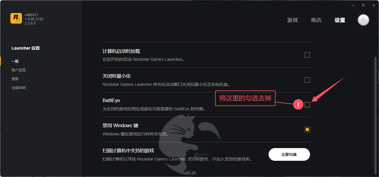 同时按下 Win键+S ,输入 Rock ,打开 Rockstar Games Launcher ,登录 - 右上角设置 - 找到 BattlEye 并启用/关闭 (默认黄色,代表开启)