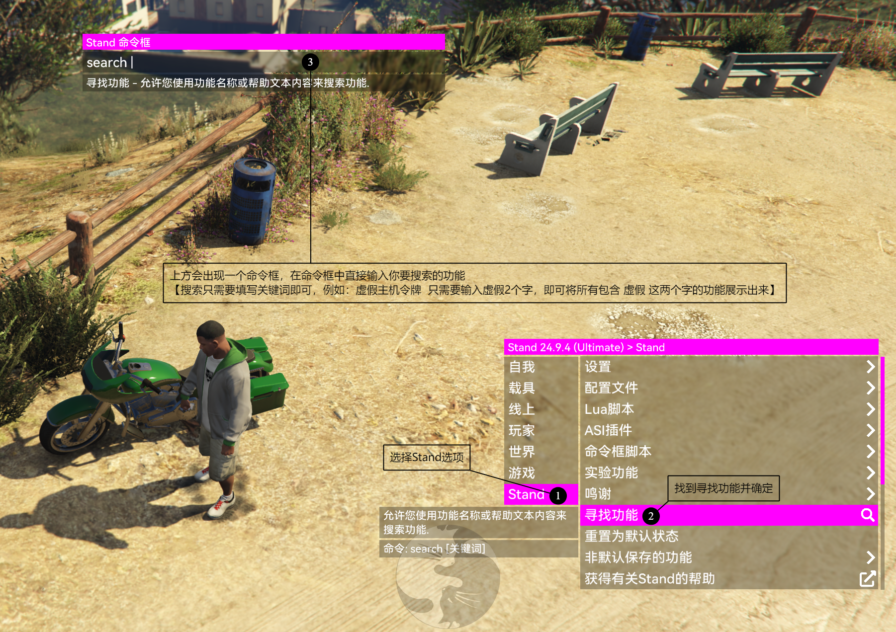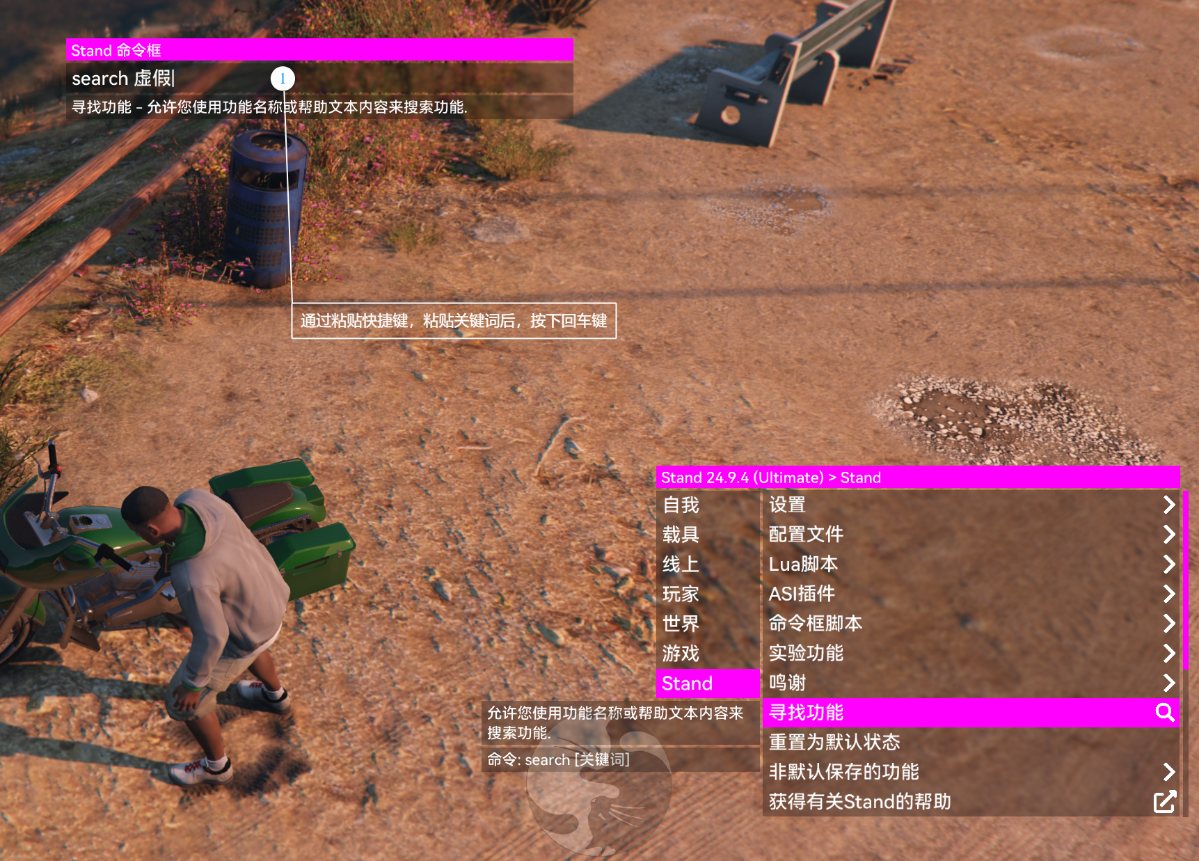 GTA5-侠盗猎车手V教程Stand 屎蛋Stand 寻找功能教程本页总览Stand 寻找功能教程 搜索功能 绿色另外,命令框中无法输入中文,但是你可以在其他 任何可以输入中文 的地方输入好后,复制粘贴到命令框复制快捷键:Ctrl+C粘贴快捷键:Ctrl+V 例子